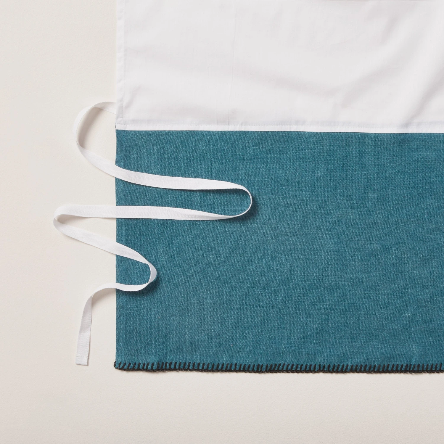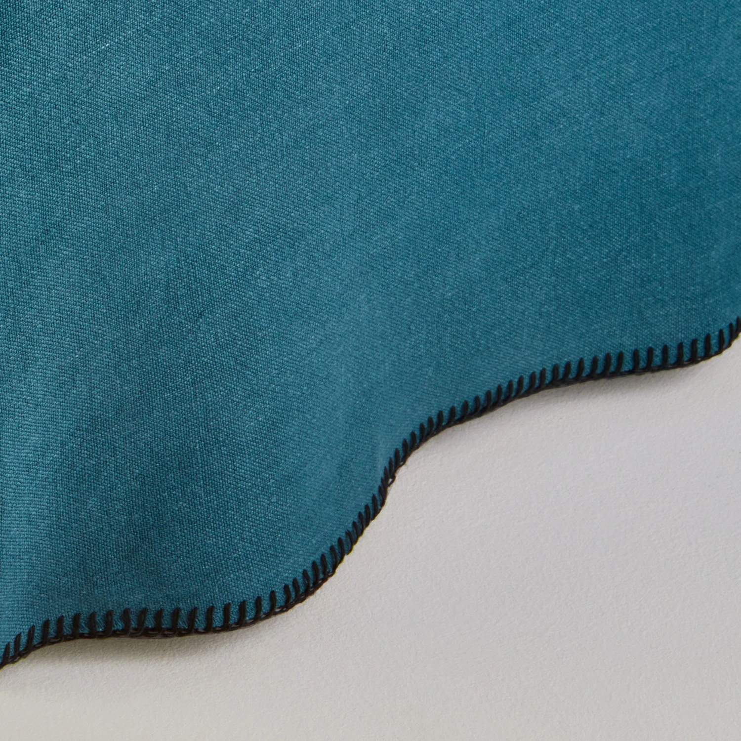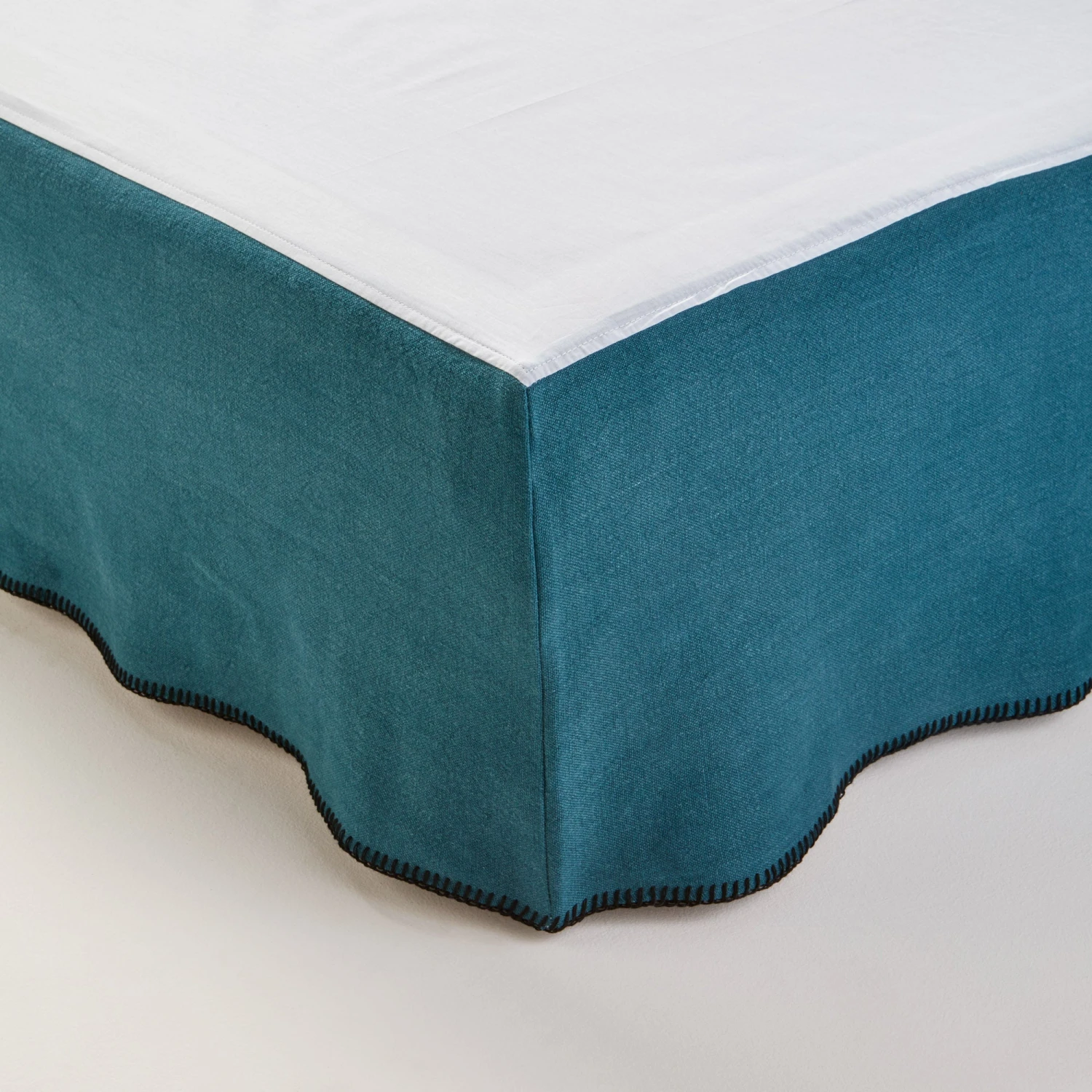 Le cache-sommier Nino, en lin lavé épais orné d’un feston noir se décline dans une teinte bleu océan et ne manque pas de charme naturel !