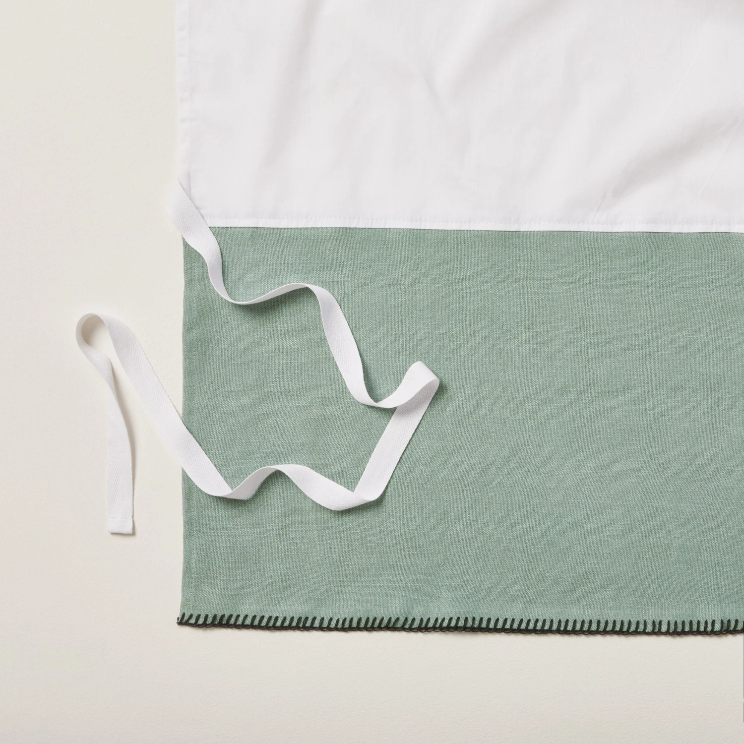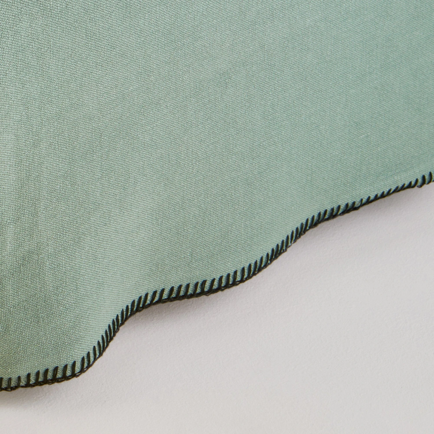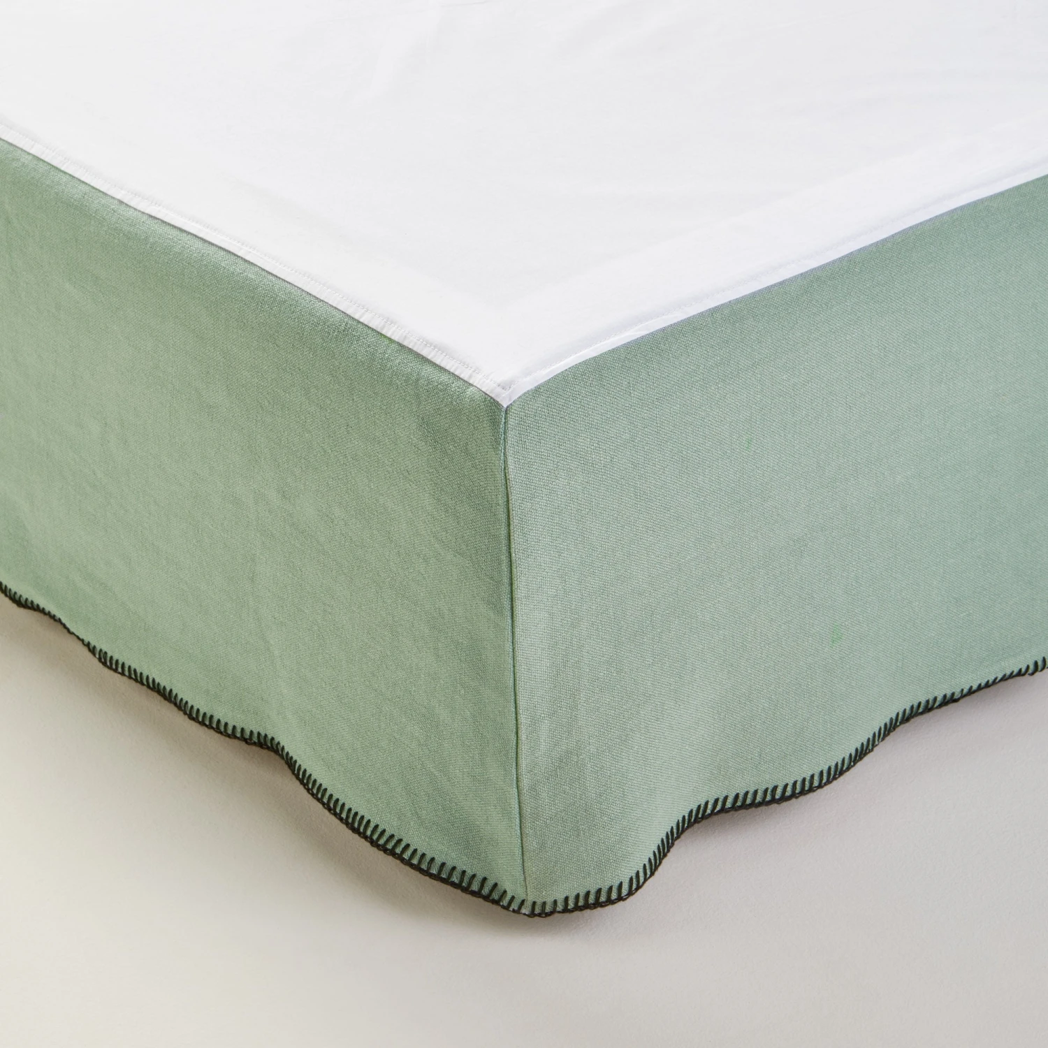 Le cache-sommier Nino, en lin lavé épais orné d’un feston noir se décline dans une teinte vert grisé et ne manque pas de charme naturel !