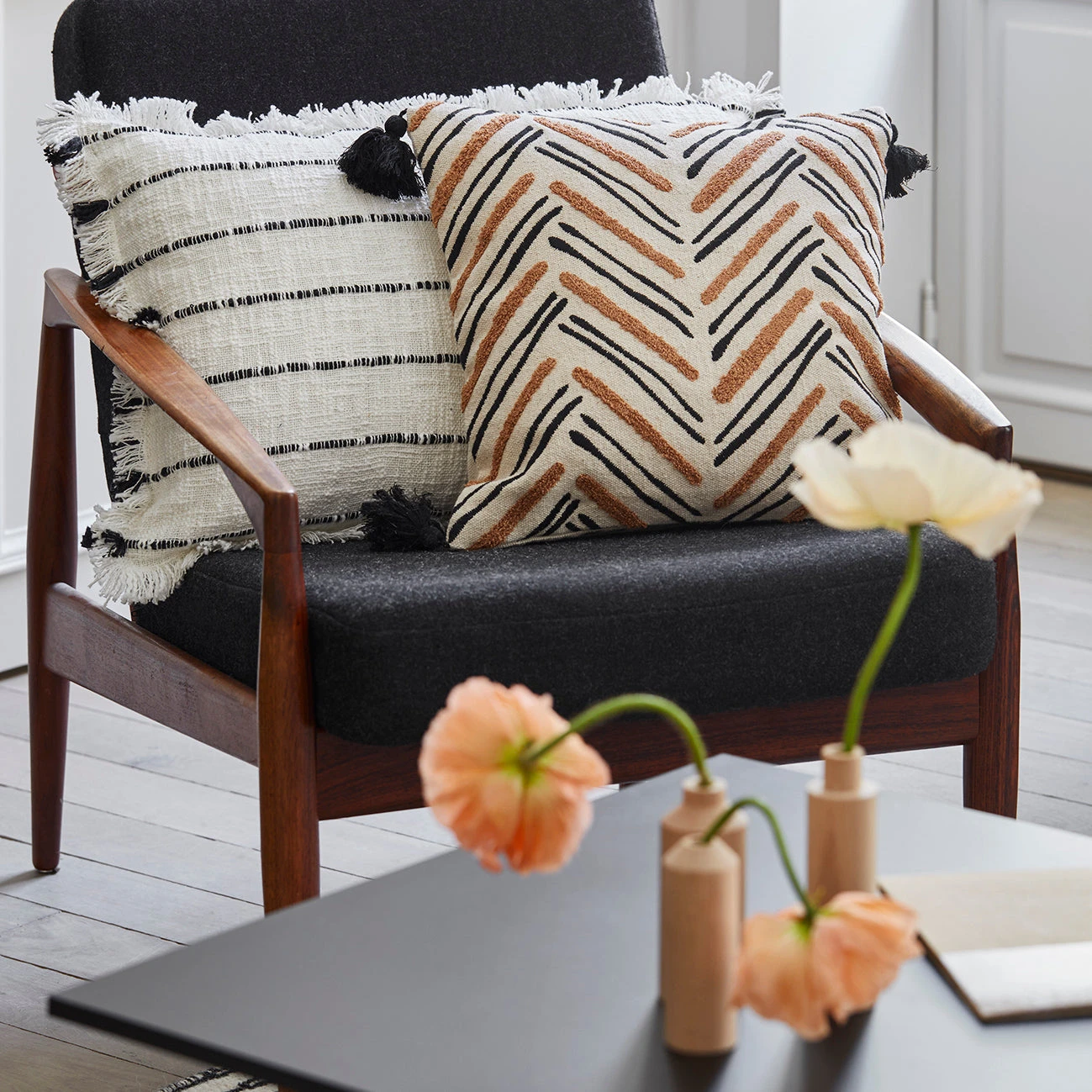 Ses pompoms, sa broderie bouclette ainsi que sa finition bourdon donnent au coussin Oumy une allure ethnique, riche en détails.