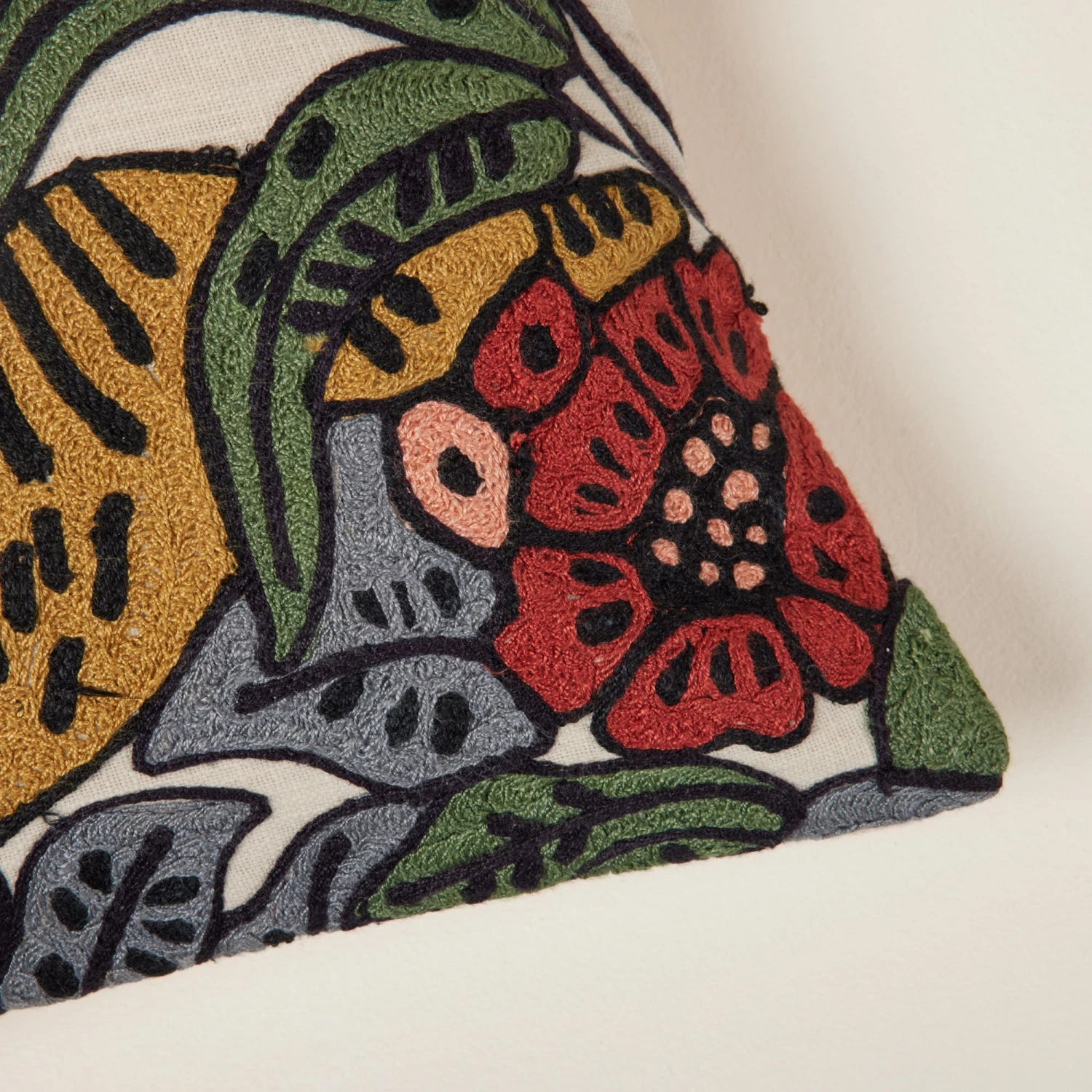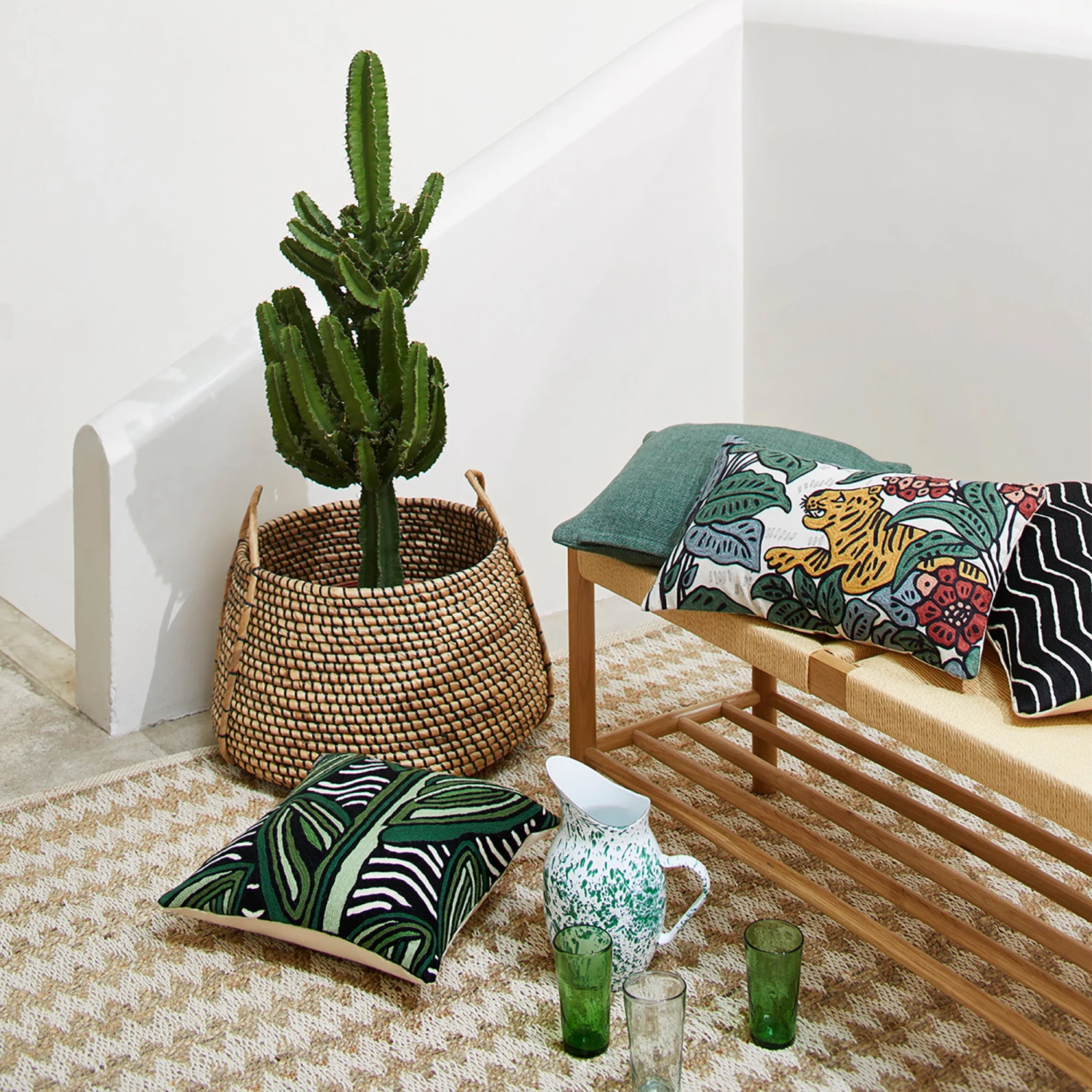 Décliné sur une toile de coton, le motif Tigris issu et retravaillé à partir d’une archive Madura fait penser aux jungles naïves du Douanier Rousseau.