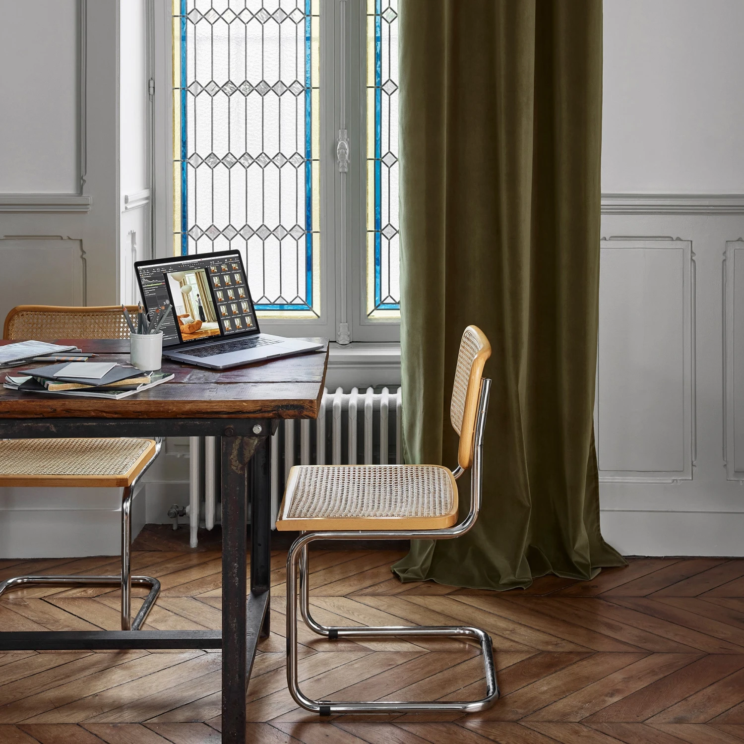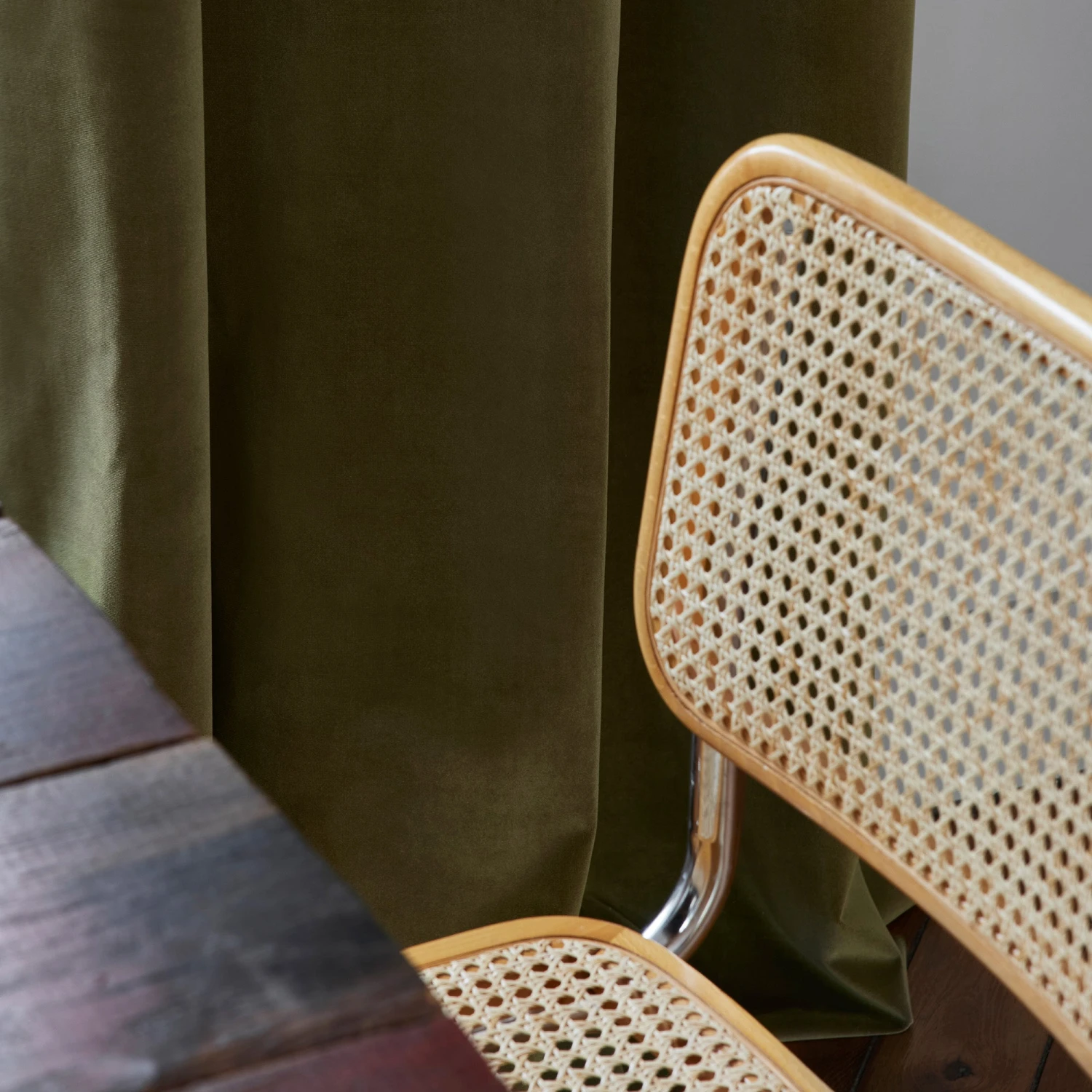 Le rideau en velours ras Matia capture la lumière et donne de subtils reflets mats aux teintes chatoyantes de son coloris vert cyprès.