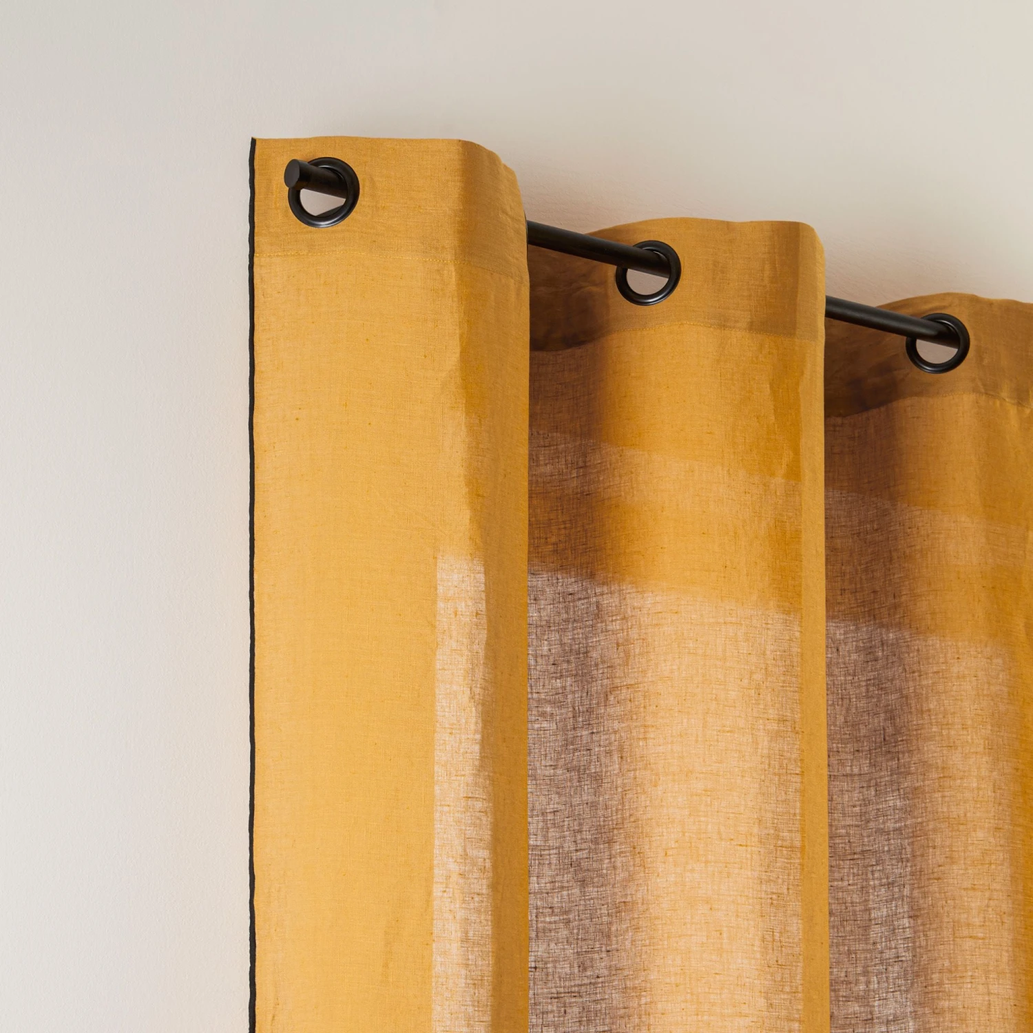 Le rideau à oeillets noirs Carlina ocre et bourdon noir est beau par son évidente simplicité. Réalisé avec des œillets noirs et souligné d’un point bourdon noir, ce rideau en lin léger s’installe facilement sur vos fenêtres et les habille d’une ondulation délicate au charme bohème.