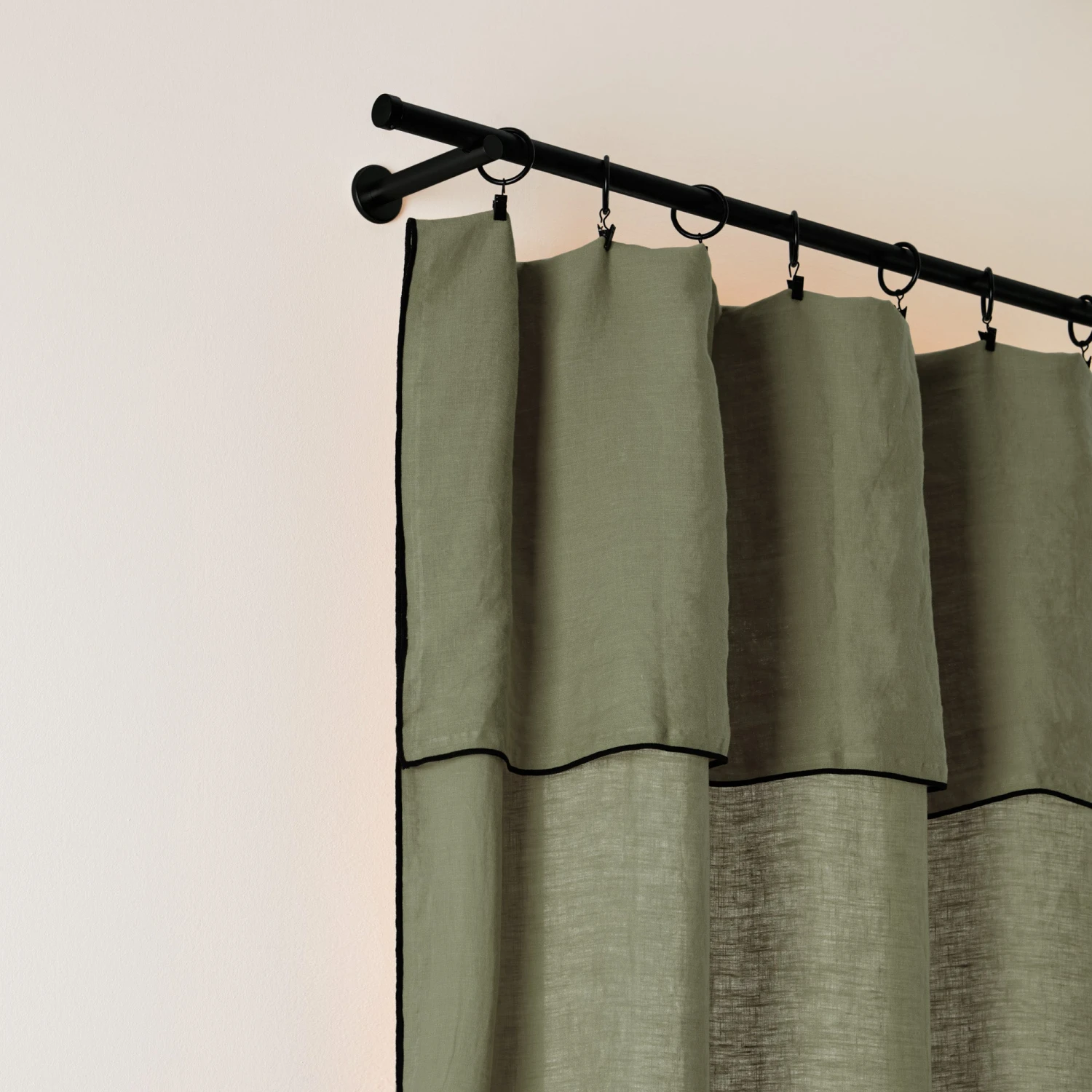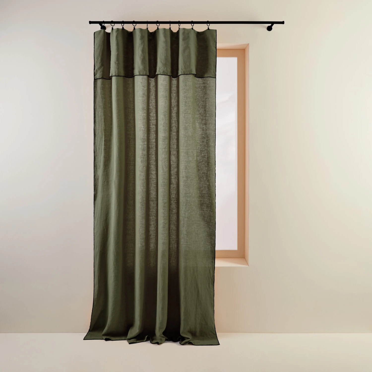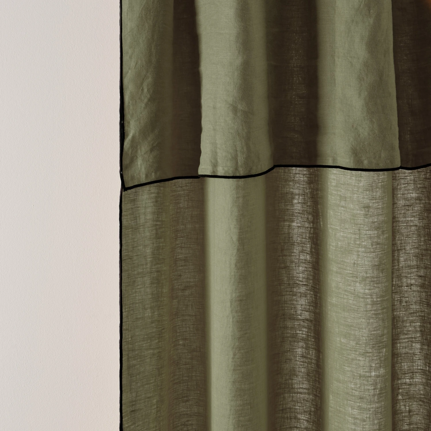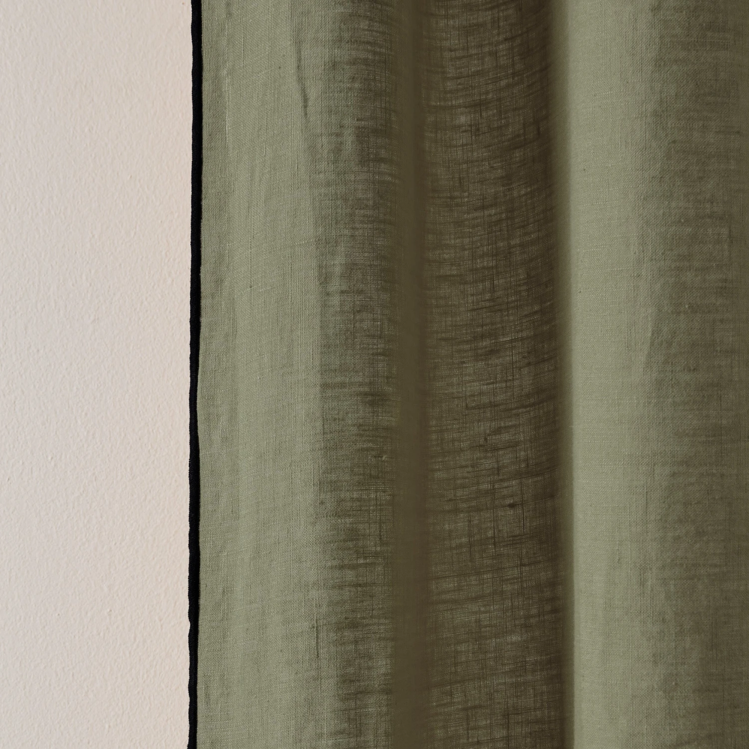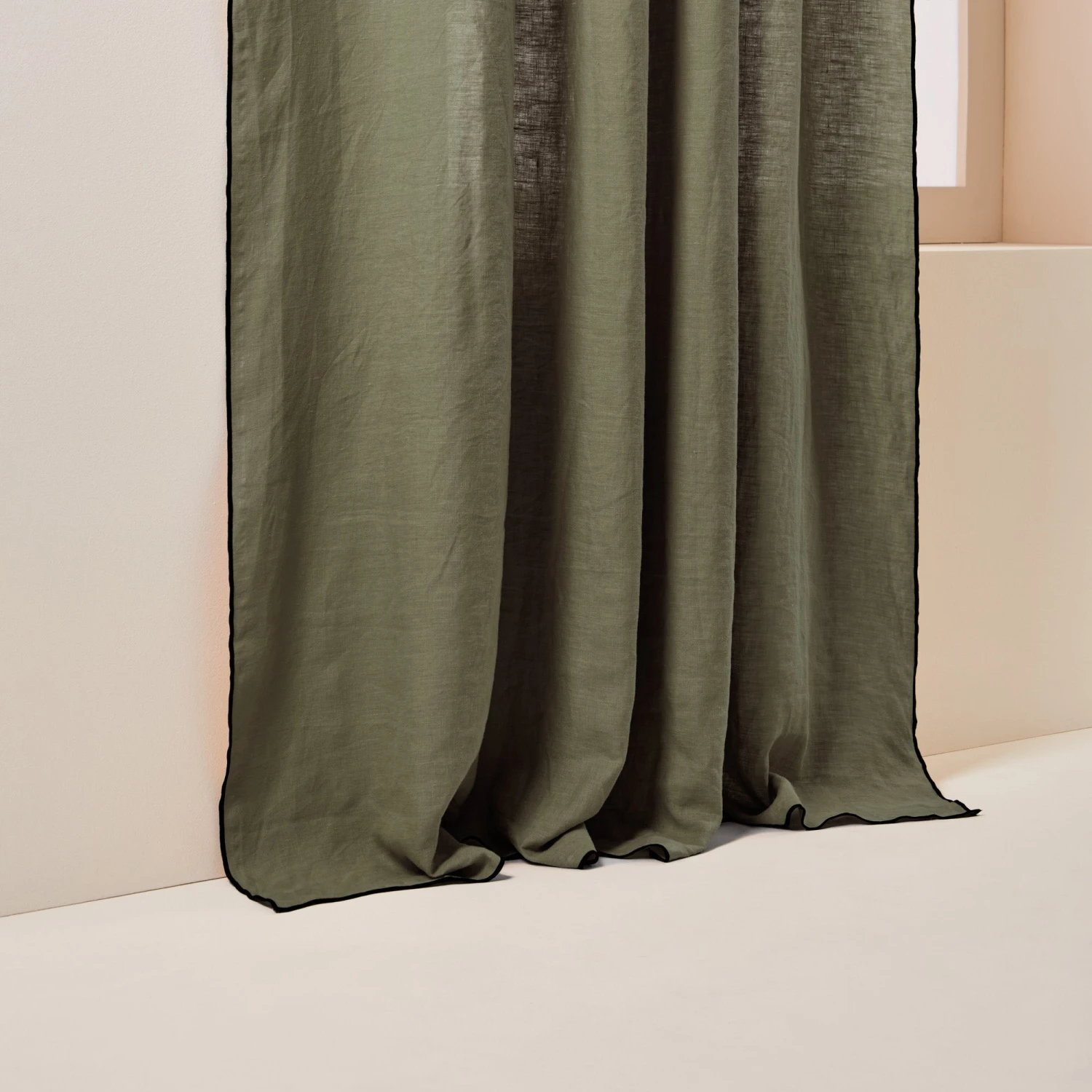 Le panneau en lin lavé Carlina kaki grisé, avec son point de bourdon noir qui souligne son contour, est beau par son évidente simplicité. Ce rideau en lin léger offre une ondulation délicate au charme tant moderne que bohème.