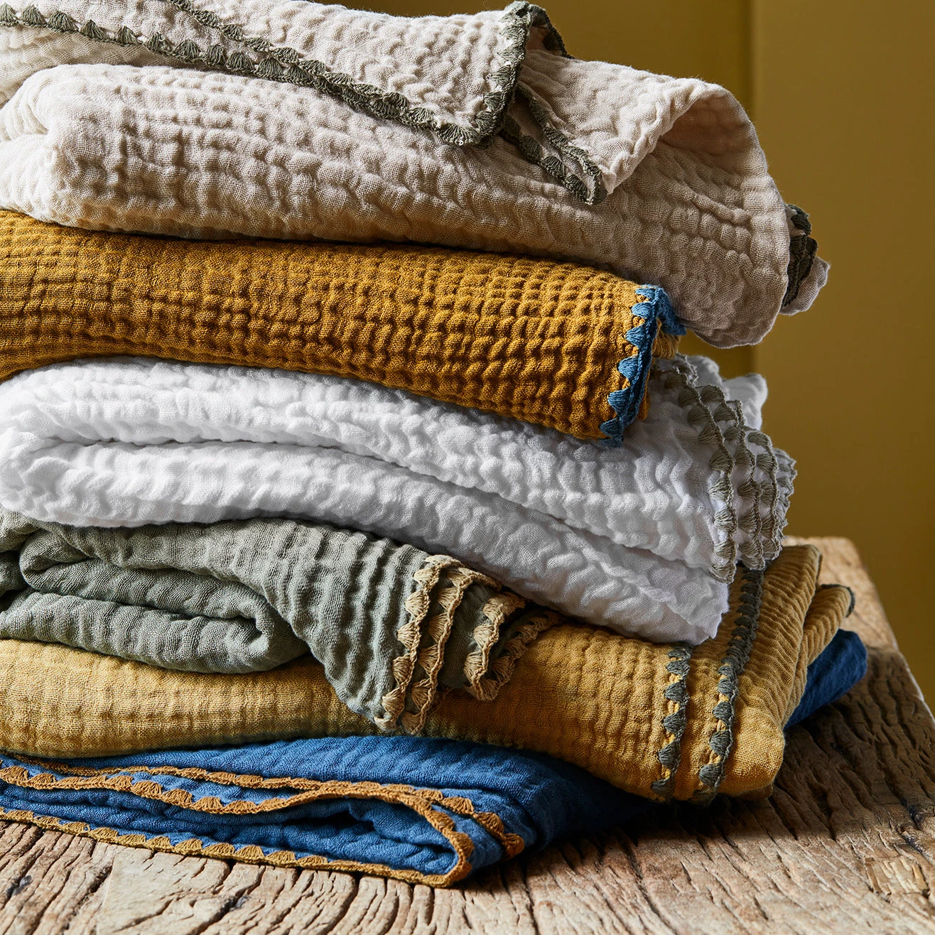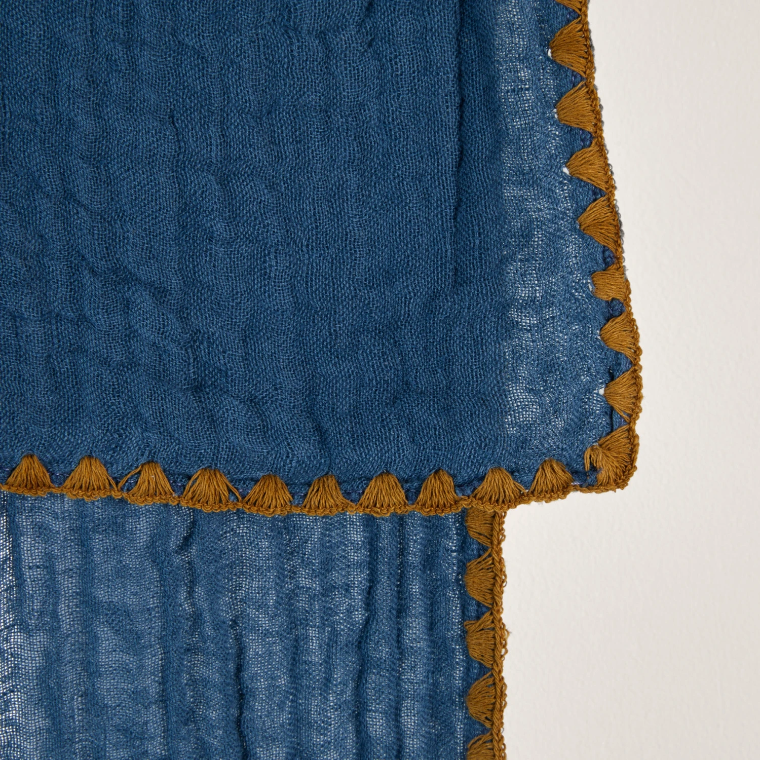 On aime le panneau Lalita pétrole et bronze pour sa douce gaze de coton lin. Sa broderie contrastante offre une touche singulière à ce tissu gaufré.