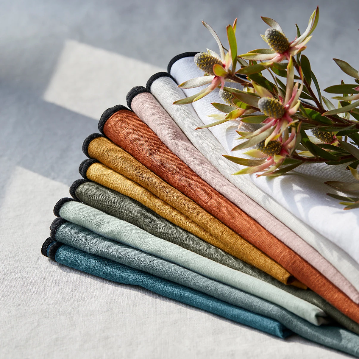 Lin lavé légèrement froissé, cette fibre 100% végétale est devenue incontournable et se décline en serviette, set et nappe pour créer une parure de table complète.