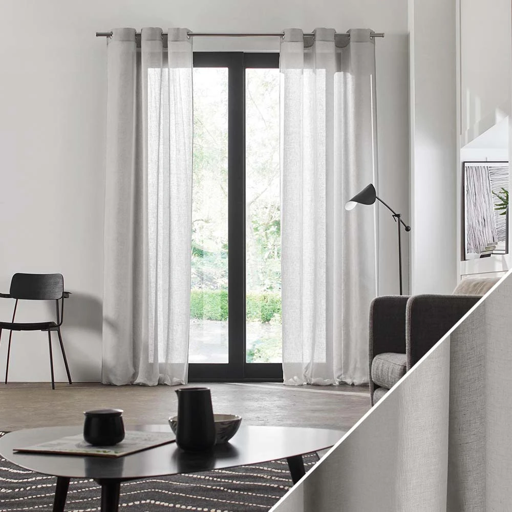 Avec son tissage de lin léger, c’est en toute discrétion que le voilage Shadow gris brume en 100% lin se fond sur vos fenêtres.